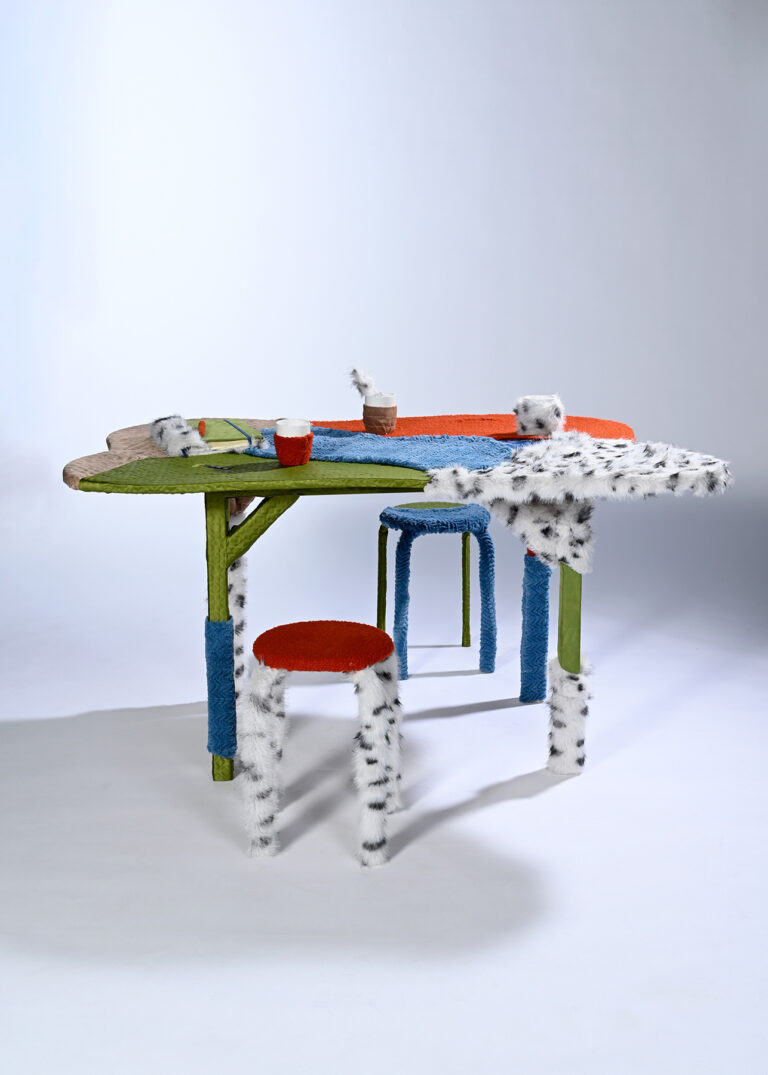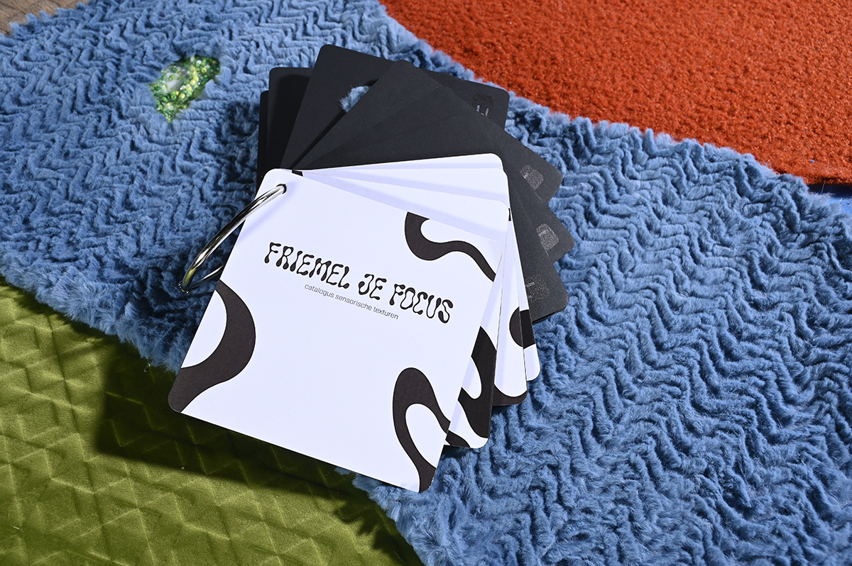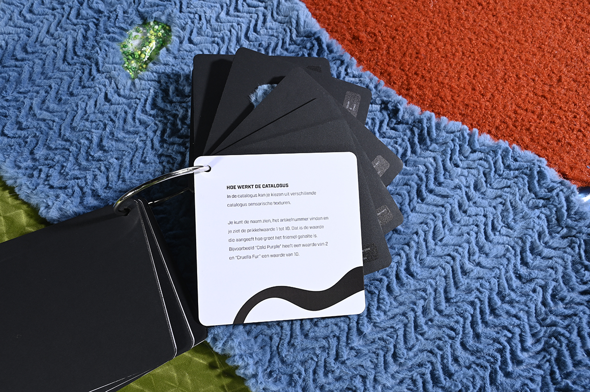 De tafel is gemaakt met verschillende sensorische texturen met een prikkelwaarde van 1 tot 10, zoals knopjes, stof en slijm.