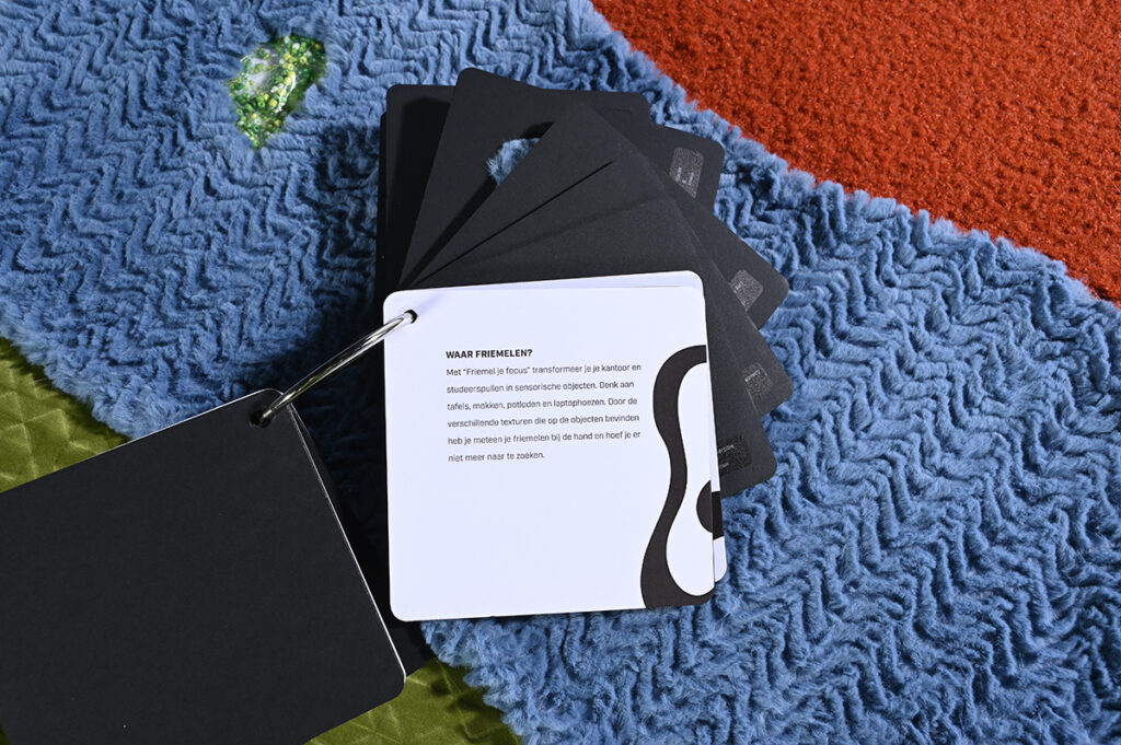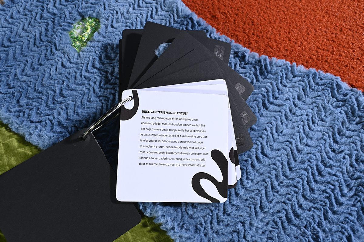 Friemel je focus is gemaakt voor mensen die niet stil kunnen zitten. Als je ergens aan kunt voelen, kun je je aandacht beter sturen; het neemt de ruis weg. Door te friemelen neem je meer informatie op.