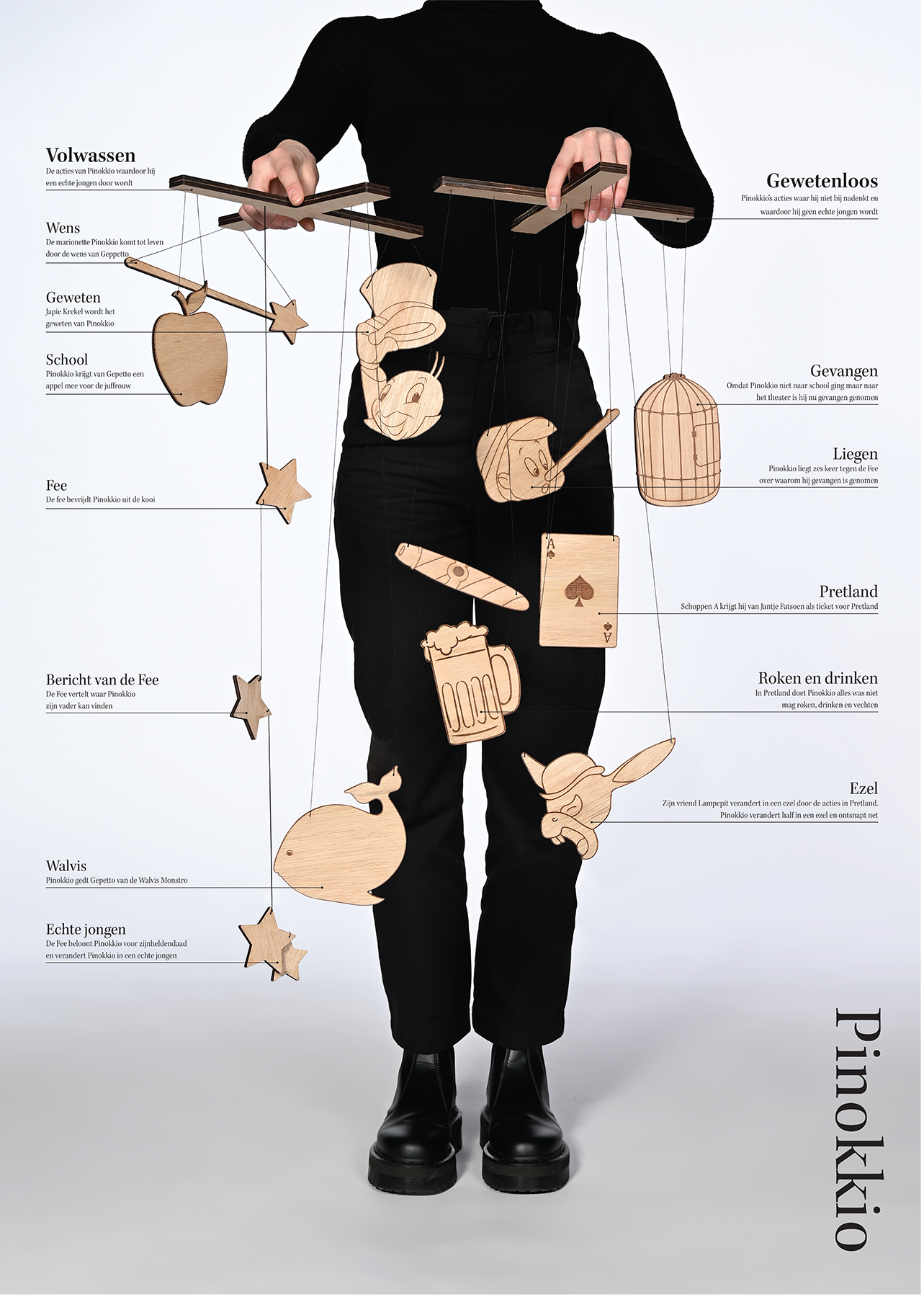 INFOGRAPHIC PINOKKIODE LEVENSLOOP VAN PINOKKIO NAAR EEN ECHTE JONGEN. WEERGEGEVEN IN EEN RUIMTELIJKE INFOGRAPIC.
