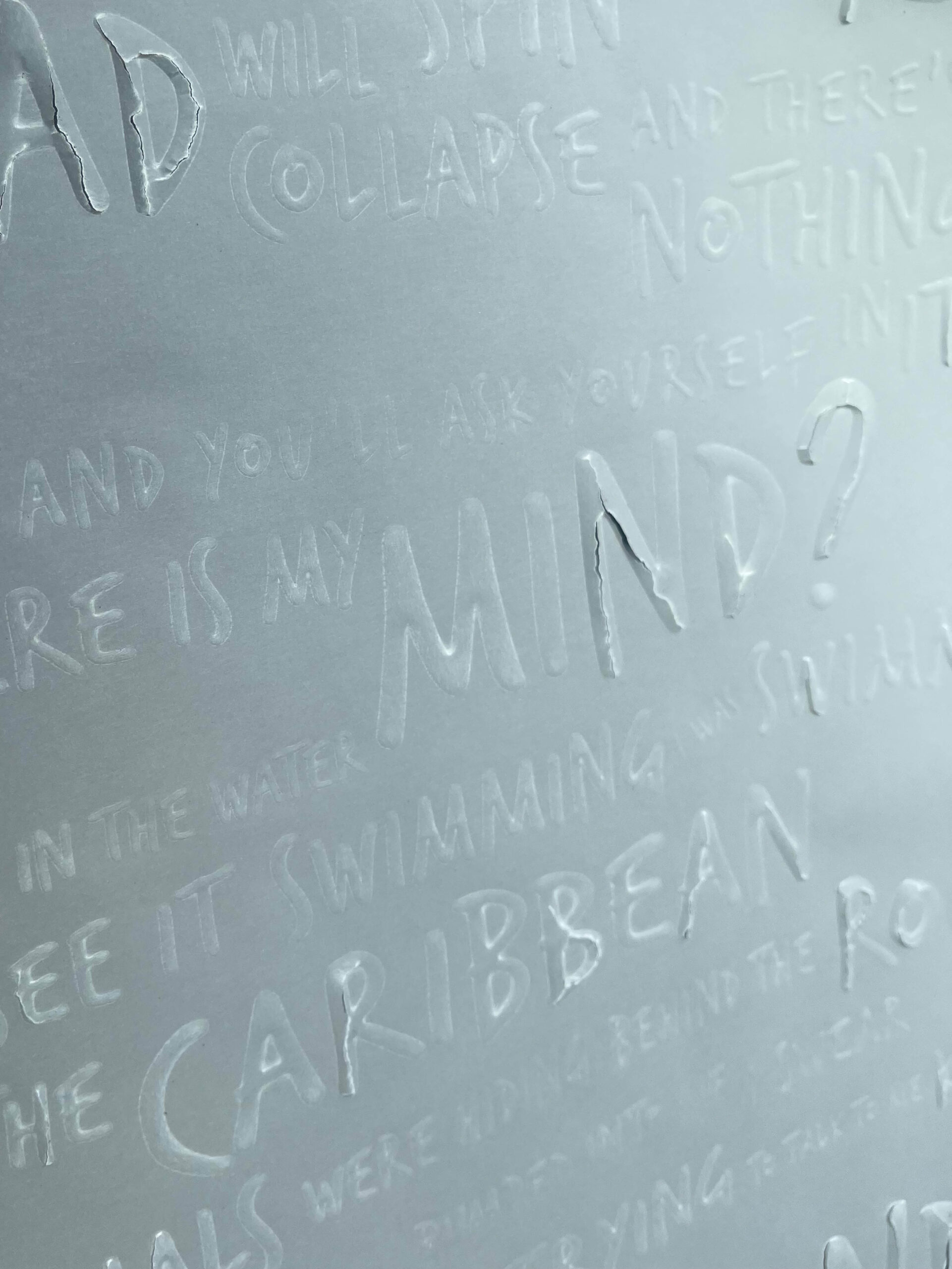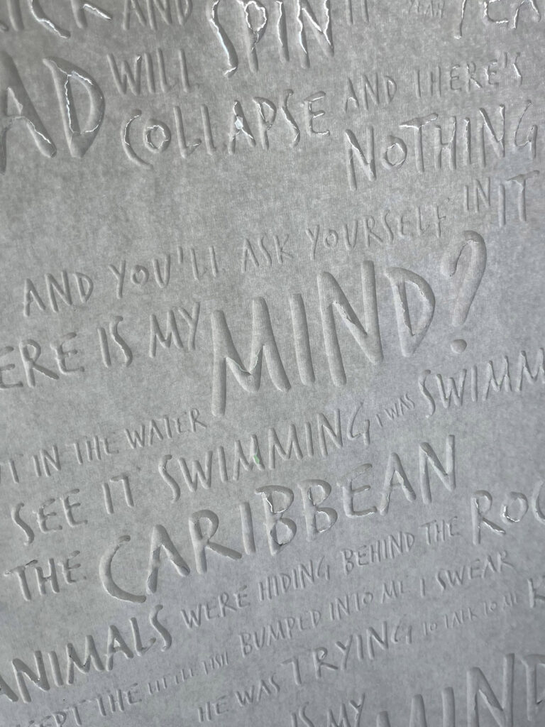Tekst van where is my mind van de pixies. typografisch vormgegeven door middel van blinddruk.